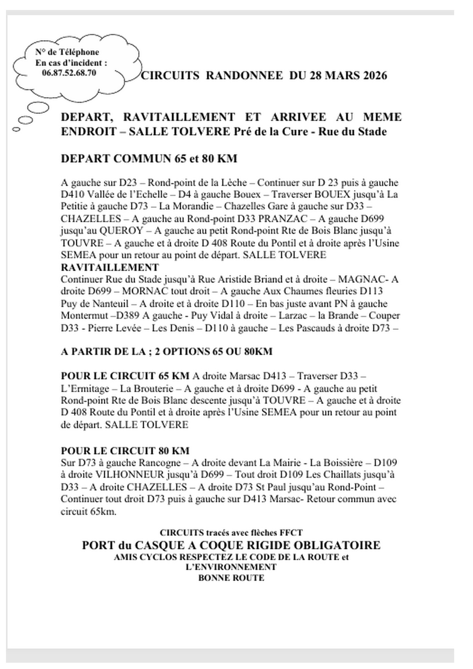 Le Cyclo Club Tolvérien organise le 28 Mars 2026 sa traditionnelle Randonnée des